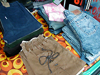 車は緑色のダイハツ・ミゼットを使用。陳列用の棚やハンガー掛けを取り付けるなど、自分たちで改造したのだそうだ。商品数は約500点でメンズとレディースの割合は6:4。靴やサングラス、ベルトなどの小物やベビー服も扱っている。