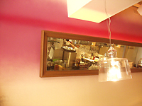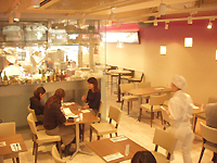 内装はフランスの最新のカフェを意識している。今回の出店にあたりオーナーが渡仏し、くまなくリサーチしてきたのだそうだ。テーマカラーであるペールバイオレットのグラデーションが美しく、シンプルな家具が落ち付いた印象を与えてくれる。25坪・30席の店内にはガラス張りのキッチンが組み込まれており、女性スタッフの活気が店内に色を添えていた。
