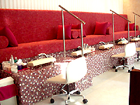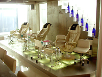 1Fフロントサイドは、オリジナルのカラフルなネイルチップが並ぶブティックとウエイティングスペース、マニキュアエリア12席。バックサイドは、「ピンク・ペディキュア・ラウンジ」6席。2Fは会員制の「プラチナラウンジ」で、エスプレッソやカクテルなどをサーブするカウンターを中央に、左手(フロントサイド)はマニキュアとペディキュアを同時に受けられるパーソナルチェアが8席。右手(バックサイド)はパーティエリアとVIPルームが1室という「セレブな空間」となっている。