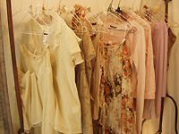 店舗面積は14坪。ブランドのイメージカラーである白で統一された店内には、アンティークのシャンデリアや家具が配備され、どこかノスタルジックな雰囲気だ。季節の花や絵本がディスプレイされていたり、ハンガーにビーズやコサージュなどの装飾が施されていたりと、女性の心をくすぐる演出が至るところになされている。