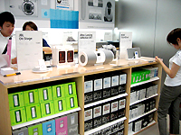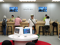 2階建ての1階は、アップルの最新商品の展示販売コーナーがメインで、ガラスでできたスケルトンの螺旋階段を上がると、音楽関連製品をはじめとする各種周辺機器やソフト、キッズコーナー、そして修理等、専門家による相談コーナーのGenius Bar(ジニアス・バー)と、基本的な構成はアップルストア銀座店と同じだが、若干、iPod関連の展示スペースが広い印象を受けた。