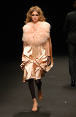 「ピエール・マントゥ」というイタリアのタイツのブランドの営業をやってます。今日は、恵比寿のバー「プントプンタ」で知り合ったお友だちに誘われて見に来ました。イランイランは個人的にも好きなブランドで、ヴィクトリアン調の流れの中にありながら新しい提案がなされていてとても良かったです。バルーンスカートとかハイウエストのベルトとか、ファー使いとか。色もいいですね。あと、フリンジっていうんですか。裾の揺れる感じがとてもエレガントで素敵でした。
