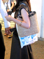 ペタンコのマクラメ調のバッグとバリで買った布のトートバッグを2個持ちしていた24歳の女性会社員は、「エコじゃなくてファッションです」ときっぱり。トレンドの小さいバッグが持ちたくて、書類など入りきらなかった荷物を入れるために「バッグの2個持ち」しているのだそうだ。ちなみにと、スーパーのレジ袋はもらわないようにしているかと訪ねたところ、「ゴミを捨てる時に必要だからもらう」との回答だった。
