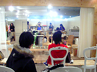 会場は、シアタープロダクツの仕事場がそのまま移動したステージに、毎日デザイナーをはじめ全社員が出社し、実際に働いている様子がライブで見られるというもの。もちろん、電話が掛かってきたり、ファックスもメールも「仕事場」に届く。隣接されている応接室では、実際に打ち合わせが公開で行われ、その日の予定は随時ホワイトボードに書き込まれていく。週末のミーティングはパフォーマンスや音楽のライブへと発展していく事も。