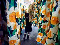 エレベーターを降りると大量の花柄の布の塊が目の前に広がり圧倒される。よく見ると、それらの1つひとつはバルーン状になったロングスカートが天井から吊り下げられたもので、その数はなんと全部で150枚。そんな「スカートの森」が、ただ者ではないアパレルメーカー、シアタープロダクツの劇場へと誘う。