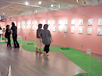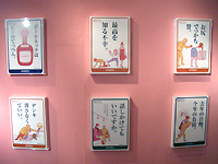 「タイツくん」の人気コンテンツ「励行のこと」カード(通称:励行カード)は、様々な角度から日常のふとした瞬間を切り取ったもの。松岡さんのコピーの妙とイラストレーターの高橋潤さんのドライなイラストの組み合わせが、日常に潜む笑いや男女の心の襞(ひだ)を掬い取る。02年にこの「セクハラ有料」が登場して以来、総数は360枚に達し、今回の展覧会ではこの"励行カード"を100枚以上展示した。これだけの数を一堂に集めたのは、今回が初めてだという。励行カードを見て回るだけでも楽しいが、この展示には隠された仕掛けもある。