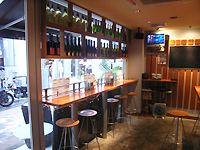 店舗面積は15坪。内装は猪野さんのイメージする「楽しく気軽に立ち寄れる店」をもとにデザイン。オープンキッチンを囲むカウンターや、ハイスツールのあるテーブル席に加え、道路に面したスペースにはスタンディングテーブルを並べ、空間を無駄なく最大限に利用している。