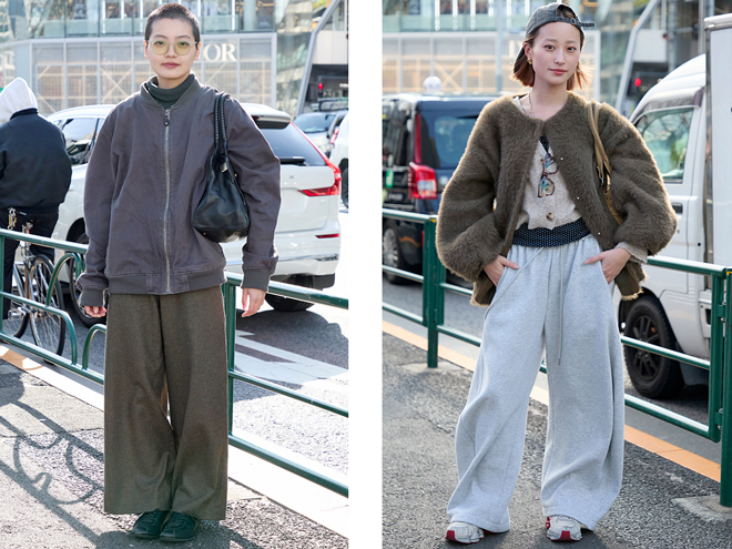 (右)バルーンシルエットが特徴的なスウェットパンツは地底人で買ったもの(https://www.web-across.com/observe/cvs00a0000005abw.html)。