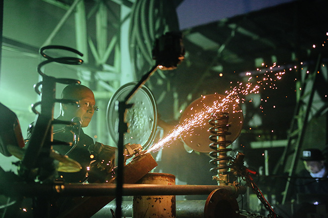 鉄工所の鉄や鋼を楽器として使いライブを行った。