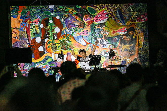 メインステージでは多彩なライブが開催された。朝一番は「根本敬ゲルニカ計画」の除幕式で、『樹海』というタイトルの絵がお披露目され、根本敬さんのDJに合わせて岸野雄一さんがパフォーマンスを行った。その後、「F.I.B JOURNAL(エフアイビージャーナル)」や七尾旅人さん、石野卓球さん、明星/Akeboshi」「INDUSTRIAL JP(インダストリアルジェイピー)」らがライブを行い大いに盛り上がった。