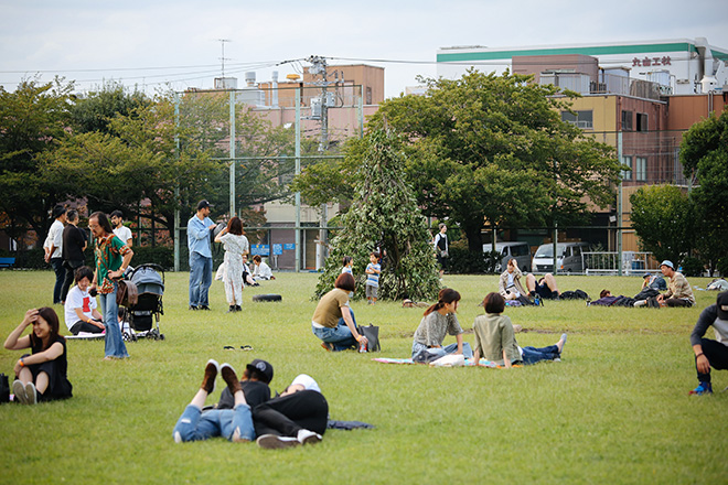 さらに周辺の公道にはキッチンカーが並び、来場者がお酒を飲んだり食事を楽しんでいる。大型トラックを改造したステージでは、「おやすみホログラム」や「社長(SOIL&"PIMP"SESSIONS)」によるDJが行われ、さらに防災公園の芝生ではダンスなどのパフォーマンスなどが行われており、歩けば何かにぶつかる、初めてのものに出会う、という状態で自分の中の既成概念が破れていく感覚が新鮮だった。