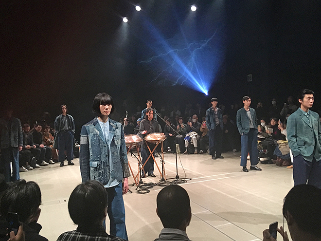 2018年3月に開催されたAmazon Fashion Week Tokyo。「KUON」のショーでモデル兼奏者を務めたハンドパン奏者の久保田リョウヘイさん(写真中央)。