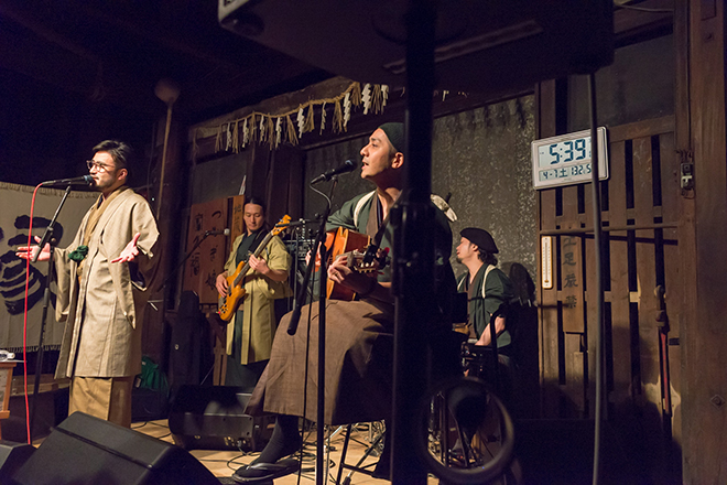 そして「結いのおと」最大の特徴が、市街地に散在するライブ会場だ。たとえば今回の会場は、お寺(弘経寺)、酒蔵(武勇酒造、結城酒造)、飲食店(Café La Famille、御料理屋kokyu)、結城紬の問屋(奥順つむぎの館、奥順新座敷)、取り壊し前の銭湯(喜興の湯)。なかには、およそ音楽フェスのイメージとは結びつかないような、国の有形文化財に登録されている歴史的な建物もある。