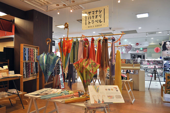 富士山駅には駅ビル「Q-STA(キュースタ)」があり、その1階にも、工場を意味する「mill」と織物産地ヤマナシを「見る」の意味から名付けられた「ヤマナシハタオリトラベルmill shop」がある。都内百貨店などでポップアップを行なった「ヤマナシハタオリトラベル」が常設展示となったもので、ヤマナシのファクトリーブランドが一堂に集結するため、工場に立ち寄る時間のない人もハタオリ産地ヤマナシの魅力を感じることが出来るスペースとなっている。