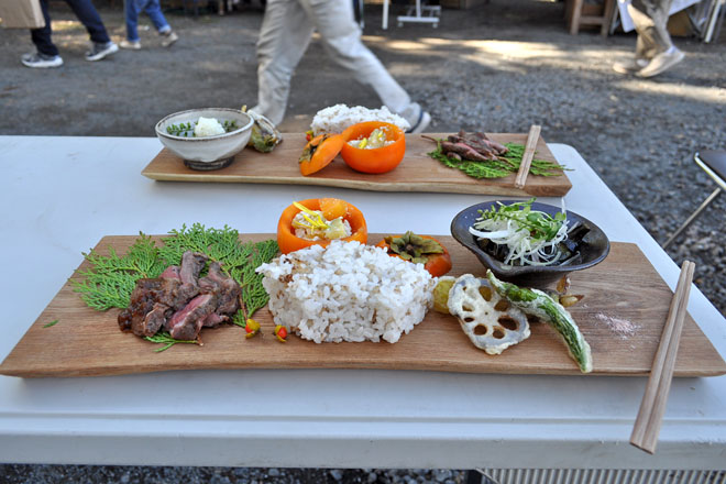 今年初参加の「ヤマワラウ」 の定食は、秋の祭りにふさわしく、柿やきのこなど秋の味覚を堪能できるメニュー。