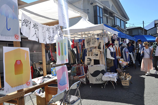 ハタフェスは、織機を使って布を織る“ハタオリ“という工程に目を向けた祭りだが、織物産業の活性だけではなく、まち全体を盛り上げようという考えで「ハタオリマチフェスティバル」と名付けられた。主に布好きの女性が集まり、来場者数は、第1回が約4,000人、第2回は約6,000人だとか。工場内でのワークショップや、生地の販売、テキスタイル作品の展示など、ふだん体験できない企画が、その魅力となっている。他にも、クロージングライブ、まち歩きツアー、古本市、フードや雑貨・古道具の販売など、様々な要素が集まっており、参加しやすい印象だ。