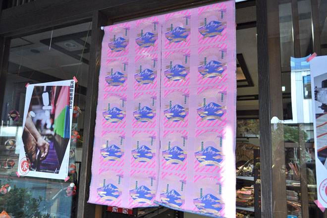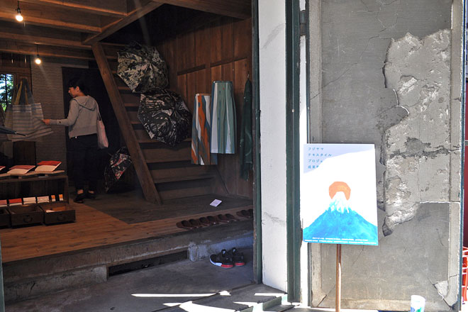 LONGTEMPSの向かいにある富士吉田のランドマーク「まるさくたなべ」では、3階を貸し切り、東京八王子市のプリント工場・奥田染工場(パルコミュージアムで開催された「KIRE・KIRE・TEN -現代の民族衣装-」でもご協力いただいた!)が開催する染色技術の勉強会「奥田塾」の塾生作品展示「布を染める」を開催。ブースには、ハギレや製品の販売も行われていた。