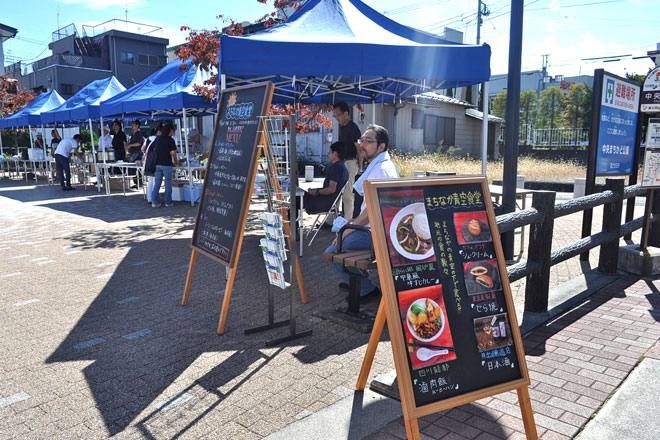 さらにメインストリートの「富士みち」を上がった先には、中央まちかど公園でなにやら催し物が。今年初出店の、「まちなか青空食堂&富士山やさいコーナー」が出店しており、盛り上がっていた。