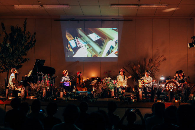 2日目のフィナーレは、毎年恒例のクロージングライブ音楽祭「ハタオリマチニヒビクウタ」が開催。今年はシンガーソングライター・ピアニストの森ゆにさんのピアノをメインに、サウンドデザインなどを手掛ける田辺玄さんと、「マッサン」や「西郷どん」の劇伴にバンドで参加するtricolorさんが、富士吉田市立下吉田第一小学校の体育館を会場に共演した。楽曲には、田辺さんと森さんが作詞作曲したハタオリマチのうた「LOOM」も!