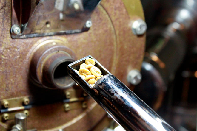 爆ぜ終わるころが「浅煎り」状態。豆の色を見ながら焙煎を続ける。理想の色になったら豆を取り出して冷まして完成。