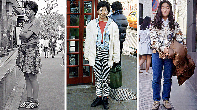 ちなみに、直近の「定点観測」では、2018年10月に「ハイライズデニム/ハイウエスト」という名称でズームアップアイテムとして取り上げている(下の写真左2点)。右から2番目は1990年9月、いちばん右は1987年5月の「定点観測」の時に撮影&インタビューさせていただいた写真で、いわゆるバブル期、“アラウンド90年”のストリートファッション(街場の流行)が、リバイバル〜アレンジが入ったリミックススタイルであることがわかる。