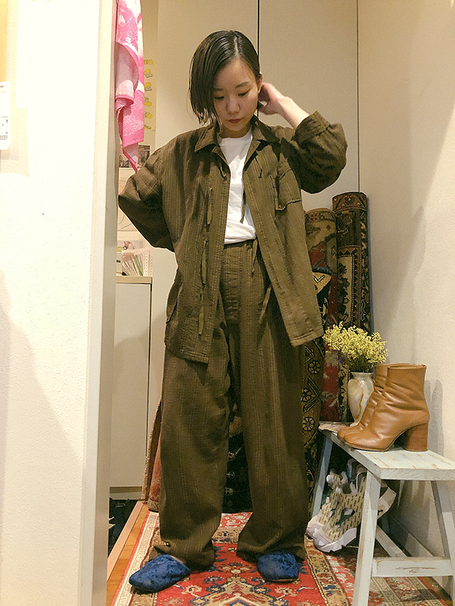 D:今日着ているパジャマのセットアップは最近買ったものです。ワンマイルウェア的なものが私も欲しくて、4月5日に買いました。名古屋のLOVE VEGASっていう古着屋のインスタで見つけたんです。去年のゴールデンウィークに名古屋の古着屋巡りの旅に行ったときに知ったお店です。軍物のパジャマを後染めしたやつみたいで。一応オンライン会議対策です。