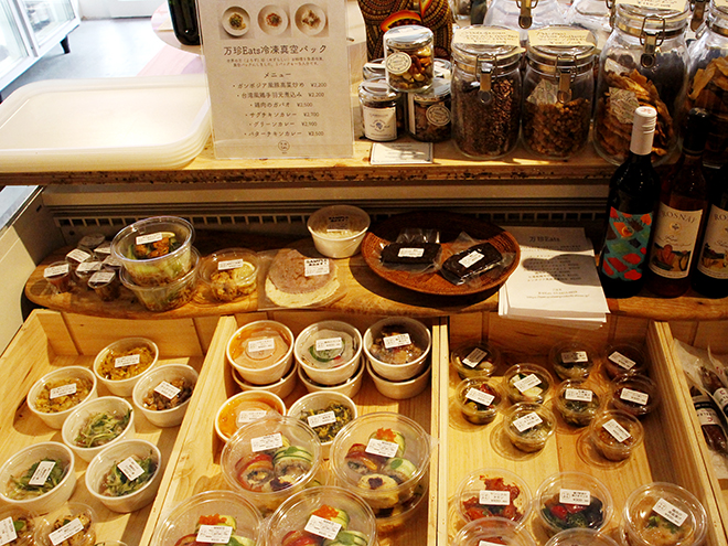 デリメニューはマリネやサラダ、生ハムなどの前菜系やおつまみ、ローストビーフやガパオなどのメインメニューまで20種以上。海老天・アボガド・とびっこなどユニークな組み合わせが楽しいメキシコの手巻き寿司「makis(マキス)」が人気だ。ほかに週一で人気カレー店「カレー屋まーくん」のカレー弁当、ウェブストアでは酒とフードの通販も展開する。