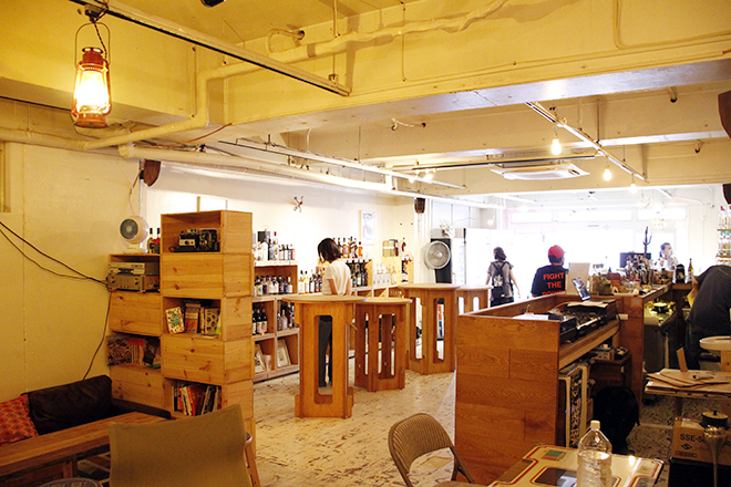 梁天井のロフト感のある開放感のある空間は、元「PREFAB Gallery and Things naijel graph(プレハブ ギャラリーアンドシングス)」(プラスチックスの故・島武実さん、DEPTの創業者永井誠治さんが営むギャラリー)があった場所。もとの空間を活かし、仲間の大工が作ったバーカウンター、DJブースや棚、テーブルなどを配置し、買い付けで見つけた雑貨やオリジナルグッズの買い物もできるラウンジコーナーを併設した。