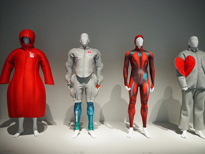 「BORDERLESS」と題した第3章では、そうした挑戦の数々とその実りを目の当たりにできる。中核をなす展示はターセム・シン監督と組み、衣装を担当した3本の映画「ザ・セル」「落下の王国」「白雪姫と鏡の女王」。どれも視覚の驚きがあり、登場人物の性格を肉付けする独創性に富む。「身体」と向き合った野心的なプロジェクトも印象深い。スリリングな視覚効果と安全性を両立させたシルク・ドゥ・ソレイユのステージ衣装、歌手ビョークの斬新なミュージックビデオ、ソルトレイクシティ五輪のためにデザインした競技ウェアなどだ。