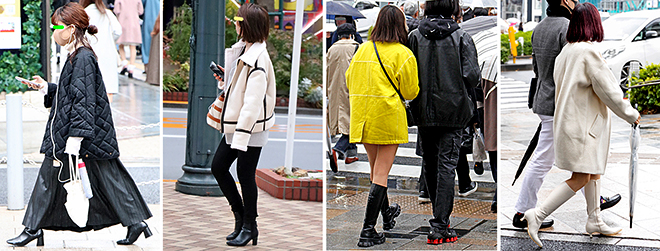 (左から順に)きれいなAラインのシルエットが目をひいたコーディネートの女性。フェミニンで品のあるポインテッドトゥのヒールブーツがマッチしていた(新宿)/黒のショートブーツと黒のスキニーパンツで脚長効果を狙ったコーディネート。今年のムートンジャケットはきれい目に着こなせる洗練されたデザインが目立った(渋谷)/ゴツゴツした重ためのソールが迫力のあるロングブーツ。10〜20代前半の若い女性は太ももを潔く出していた(原宿)/存在感のある真っ白なロングブーツを合わせた全身オフホワイトのスタイル。ローズウッドのヘアカラーが映える(原宿)。