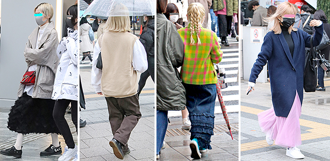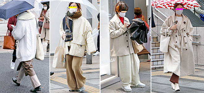 (写真左から順に)ケーブル編みニットとボリュームのあるマフラーで冬っぽい装い。茶色や薄いピンクなど、全体的に淡い「ミルクティーカラー」でまとめたスタイルが散見された(原宿)/キルティングジャケットとポンチョ風のアウターのレイヤードが新鮮。白×茶系のコーディネートも非常に多かった(新宿)/流行のジャケット&パンツをミルクカラーでまとめ、赤が差し色になっていたスタイル。スニーカーは着実にファンを増やしているgrounds(渋谷)/昨年までストリートの主役だった茶ベージュ系のデザイントレンチコートは激減。今年は白~アイボリーカラーへと明るめになっていた(新宿)。