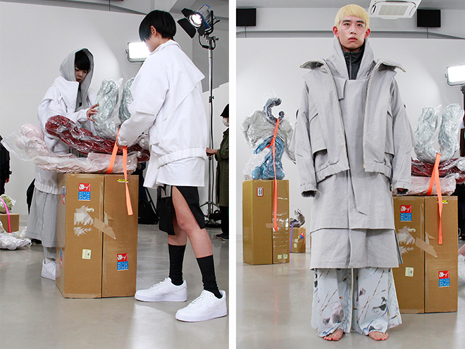 馬喰町のレンタルスタジオでインスタレーションを開催した<BALMUNG>。会場の床にランダムに置かれた段ボールがモデルたちによって次々と開かれていき、中に入っていた物体(圧縮袋に入った布)が段ボールに括りつけられ、立体作品になっていくというパフォーマンスからショーがスタート。「単なる段ボールが複雑な物体へと変化していくこの過程を通して、規格的なものと複雑で歪なものとはグラデーションで繋がっており、そこに境界線はないということを表現した」のだとデザイナーのHachiさんは話す。