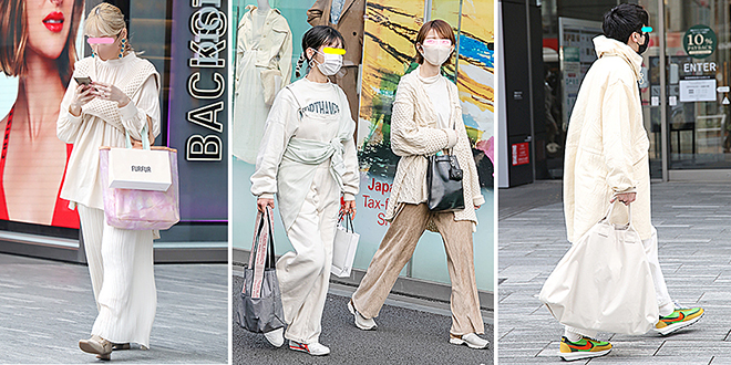 (写真左から)とにかく白・オフホワイトで全身をまとめたコーディネートが多かった。デザインに特徴のあるアイテムをレイヤードでアレンジしているのも特徴。ヘアカラーもハイトーンで一体感をもたらしているのがポイント(渋谷)/ペールトーンや茶ベージュ系も継続して人気。より淡く白っぽいコーディネートが目立った(原宿)/全身白・オフホワイトのコーディネートにプレイフルなナイキのスニーカーが効いている。ミニマムではない、ボリューム感をあわせた白の着こなしが旬だ(渋谷)。