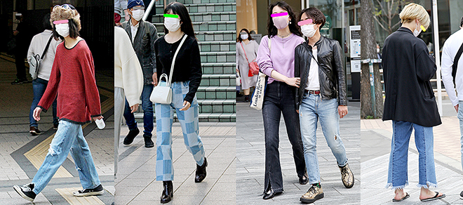 (左から順に)ボーダーTにボロボロのダメージジーンズ、そしてジャックパーセルにサングラスと、カート・コバーンそのもののようなスタイルの男性。グランジっぽいムードが再燃している(新宿)/パッチワークっぽいジーンズが浮上している。整然としたパターンでチェック柄のようになったデザインのジーンズは古着っぽさがなく、クリーンな印象もある(新宿)/同じデニム素材でも全く異なる表情のフレアジーンズとクラッシュジーンズを着こなしたカップル(渋谷)/「コンテナストア」で1万円で購入したリメイクデニム(渋谷)。