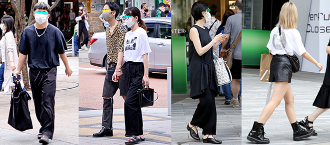 (左から)ニット素材のハーフパンツは<ユニクロ>と<マメ クロゴウチ>によるコラボレーション<Uniqlo and Mame Kurogouchi>のもの。スポーティーなミニ丈ボトムス+ロングブーツは今秋冬増えそう(新宿)/今春まで流行していた色落ちブルージーンズが減少。代わりに黒ボトムスがストリートの主役に。黒〜リジットカラーのデザインデニムも散見された(原宿)/渋谷パルコ周辺では、オールブラックコーディネートの男性が多かった。MIKIOSAKABEらによるスニーカーgroundsがアクセント(渋谷)。