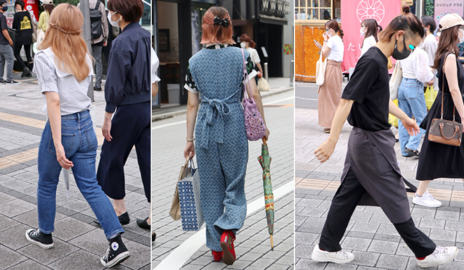 通常、GW前後は人びとの装いが大きく変化する時期ですが、4月/7月となったため、当たり前ですが、大きく変化しているだろうと思いきや、プレサーベイを実施してみると、案外そうでもない。緊急事態宣言が延長になった5月、6月にすっかり街の人びとが「通常運転」に戻ったように、装いも通常運転=日常的な装い が散見され、今月のテーマになりました。