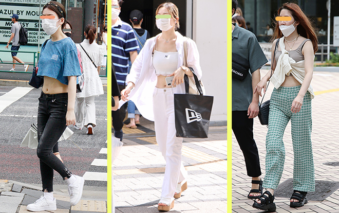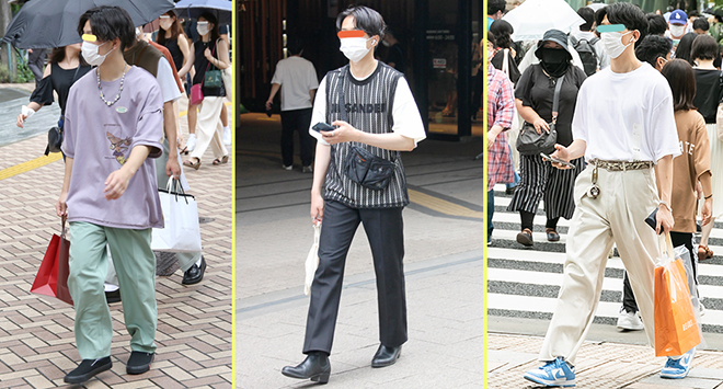 (左から)すっかり一般化したハイウエストスタイルだが、ヘソ出し〜胃出し(ミドリフ丈)のショート丈トップスが急浮上している。シャツのたすき掛けも散見された/渋谷に多いセンターパーツ男子の典型的なスタイルだった2人。服はシンプルだが、サンダルやサングラス、バッグなどにこだわりが隠れているのが特徴(渋谷)。