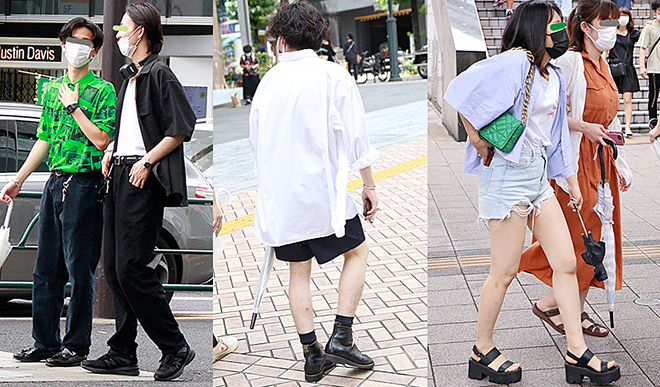 (左から)今年男女ともに人気のシャツだが、原宿では特に男性の着用が目立っていた。シャツに限らず、ポロシャツやハーフアップといった襟付きトップスが人気だ(原宿)/今夏の男性のショートパンツは長袖シャツとレザーシューズで大人っぽくまとめるのがポイント(渋谷)/まるで甚平のようなショート丈のシャツに遭遇。こちらのZARAのマトラッセ風バッグなど、今夏はグリーン系のアイテムをリリースしているブランドが多い(新宿)。