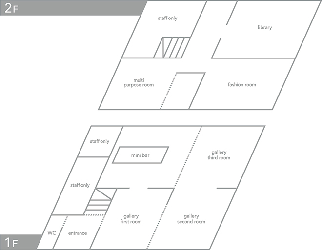 フロア構成は、1階は3つのギャラリースペースとミニバー、そして2階は多目的室と図書室、シーズンやコレクションといったシステムに与せず、「ie」の動きに合わせて変容していくというファッションルーム、ZINEの編集室。