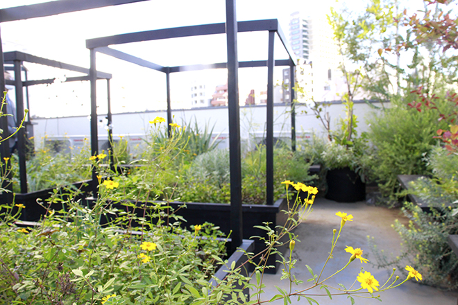 ハーブガーデンではフェンネル、レモンバーベナ、オレガノなど様々なハーブが植えられており、ビルの屋上とは思えないほど元気に育っていた。2階のバーではこちらの摘みたてハーブを使った料理やカクテルの提供も。