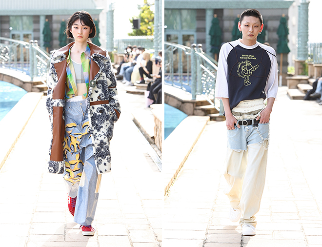 アイテムの中には、高校生時代につくった長襦袢や手書きのシャツもミックスされていたが、どれも2022年でも自然とハマっていたのは、スタイリスト・小山田孝司の力がある。彼もコトハと同じく、1990-2000年代の東京のストリートファッションを体験してきてるからこそ、おそらくショーまで言葉少なくファッションを通してふたりの会話は弾んでいったのだと思う。彼らが今までファッションをとおして人と心を通わせてきた体験は、ローライズを「腰パン」にさせ、そこから覗くパンツには油性ペンで書かれた名前が見え、当時流行ったベロを折ったユーズドコンバースが近日オフィシャルコラボレーションする新作シューズとともに登場した。