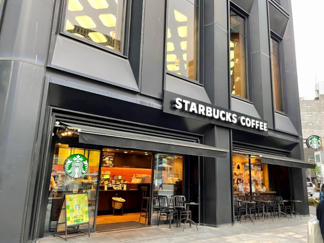 では、どんな視点からスタバを考えるのか。その点を明確にするために、一般的なスタバの様子を見ておきましょう。ここに映し出したのは一般的なスターバックスの外観です。