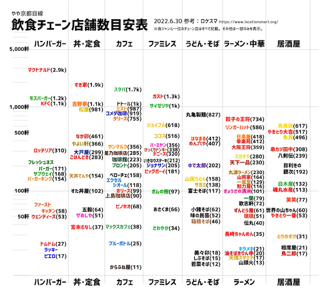 ここで1枚のグラフを見てみましょう。これは、私の友人で地理学の研究をしている永太郎(@Naga_Kyoto)さんという人が作成した全国の飲食系チェーンストアの数をまとめた表です。上に行くほど店舗数は多くなります。