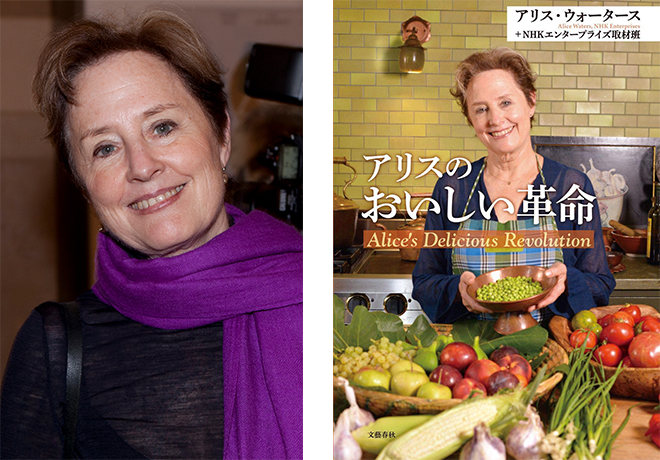左:アリス・ウォータース/右:『アリスのおいしい革命』(アリス・ウォータース著)
