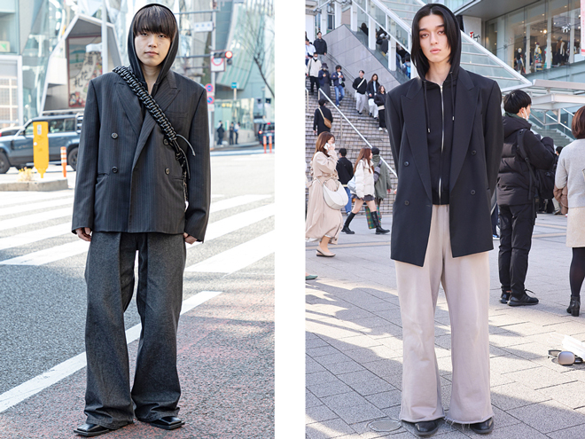(右)「OUR’sを見てジャケットとフード付きスウェットでドレスとカジュアルのバランスをとるスタイルにしようと決めました」という20歳の男性(https://www.web-across.com/observe/ppce54000000hh54.html)。