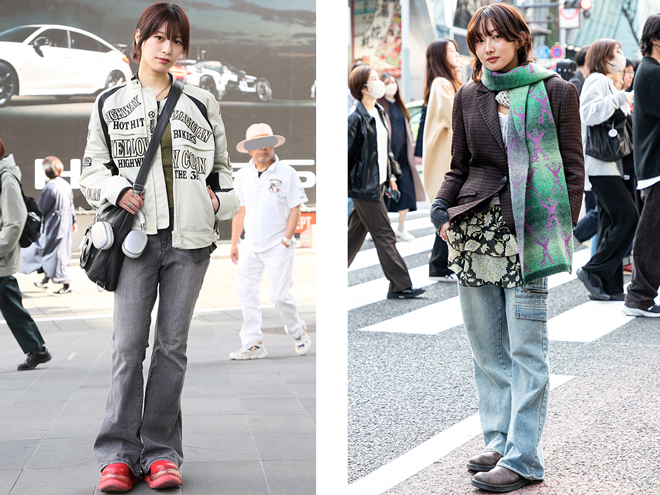 (左)「フレアジーンズをはいてきたのは、いろいろ動く日だったし、クラブにも行くこともあったので脚を出したくないなと思って」という22歳の女性(https://www.web-across.com/observe/ppce54000000hfvq.html)。