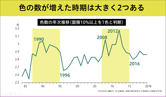 ちょうどその頃、私たちも『ストリートファッション1980-2020 定点観測40年の記録』(PARCO出版)を刊行したタイミングで、お声がけをいただいてすぐに意気投合。いくつかのミーティングを経て、同社のデータサイエンティストによる高度な解析を通じて、「どんどん白くなる若者たち」という印象的な発見にたどり着きました。