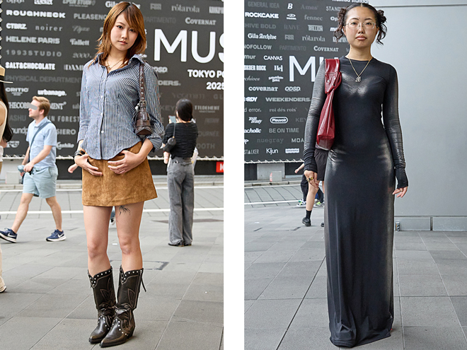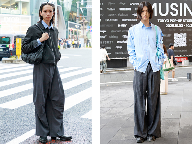 今年の定点観測ですでに取り上げている「女性横長バッグ」(2025/2)や「茶系バッグ」(2025/9)のムードが拡大・進化。小型のハンドルバッグが減少し、ショルダーバッグやトートバッグが主流化しています。バレンシアガの「ル シティ」など、 00s頃に“エディターズバッグ”の呼称で流行したサイズ感のバッグが増加。といってもカジュアルな布バッグではなく、大人っぽく上品なレザー素材が主流で、インタビューでは「ブーツと質感を合わせたくてレザーのバッグを選ぶ」という声も聞かれました。昨年ストリートに定着した、ボストンバッグやショートストラップのショルダーバッグ等の横長バッグを小脇に抱えるようなスタイルは継続して見られることもあり、2020年代以降に進行してきたバッグ小型化の流れがいよいよ変化の潮目を迎えています。
