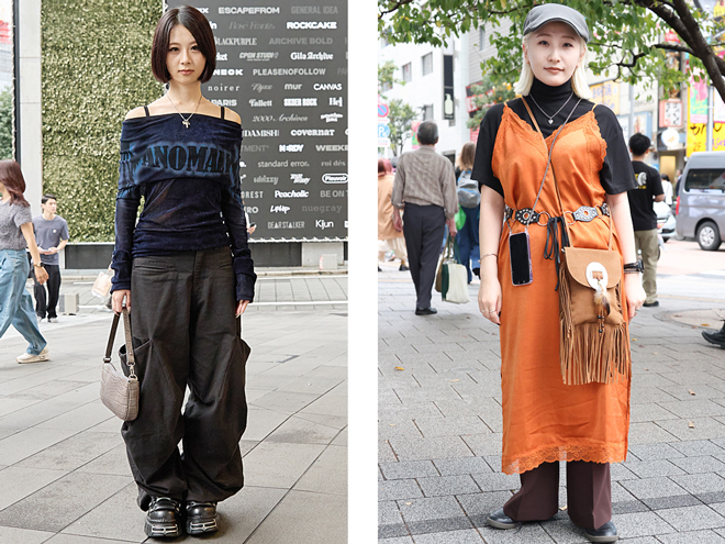 (右)鮮やかなオレンジが目を引くサテンのワンピースを着用した女性にインタビュー。フリンジやコンチョなど、00sにブレイクしたボヘミアンなテイストも再浮上している(https://www.web-across.com/observe/ppce54000005mcox.html)。