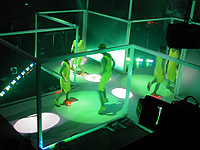 そもそも、nestとは、かれこれ10年くらい前から国内外(とくにヨーロッパ)で活動してきた、マルチメディア・パフォーマンス・ユニットである。ふだんは、ディレクター、ミュージシャン、建築家、映像作家、コンピュータ・プログラマー、パフォーマーなど、さまざまな分野で活躍する多才なメンバーで構成。一見副業(?)のようなパフォーマンスにおいても、音づくりをはじめ、映像や衣装、ギア、舞台装置に振り付けといった裏方からステージの上までと、境目なく完璧に関わりあうクールなスタンスが、いかにも「男の子っぽく」てかっこいい。「夏祭りみたいなもんですよ(笑)」(大桶さん)。